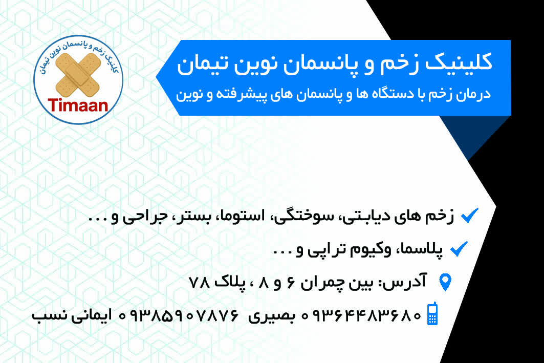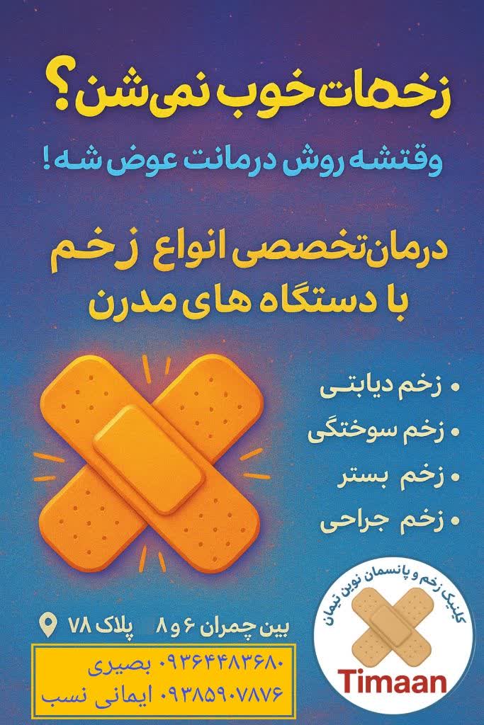 📍 آدرس: بین چمران ۶ و ۸، پلاک ۷۸ – کلینیک زخم تیمان